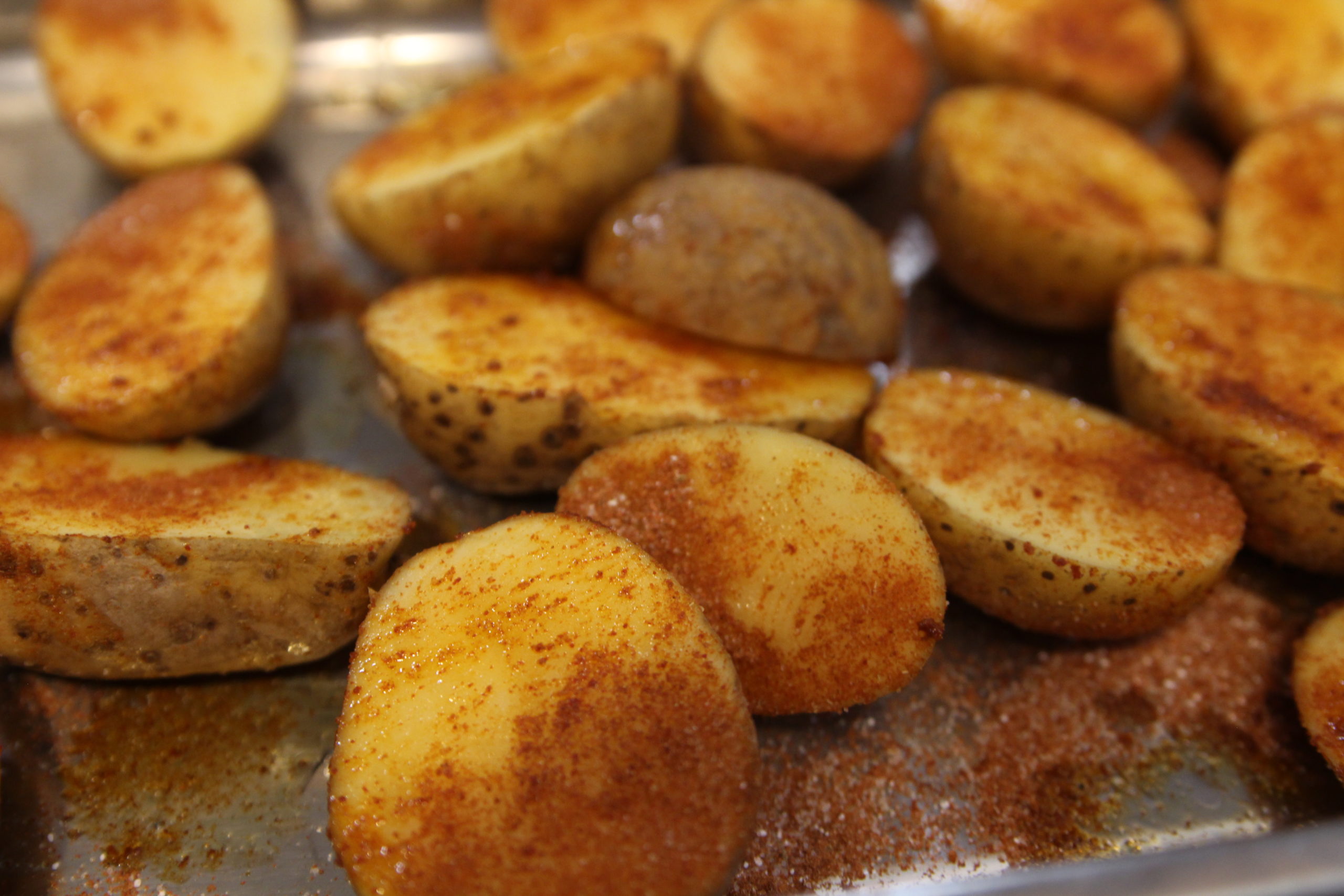 - Die Kartoffeln halbieren und mit Öl bepinseln. Mit Parikapulver und Salz kräftig würzen. Dann bei 175 Grad für ungefähr 45 Minuten in den Ofen.
